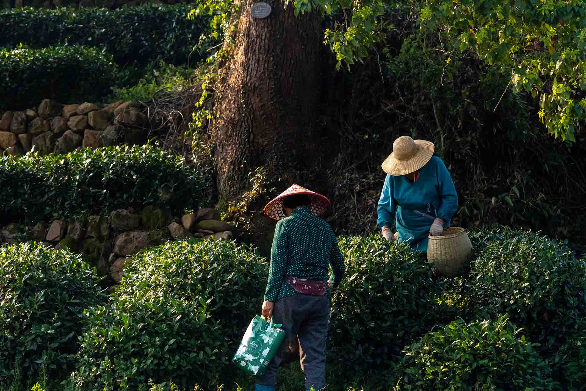 A lone picker bends over the plants in Meijiawu Town